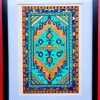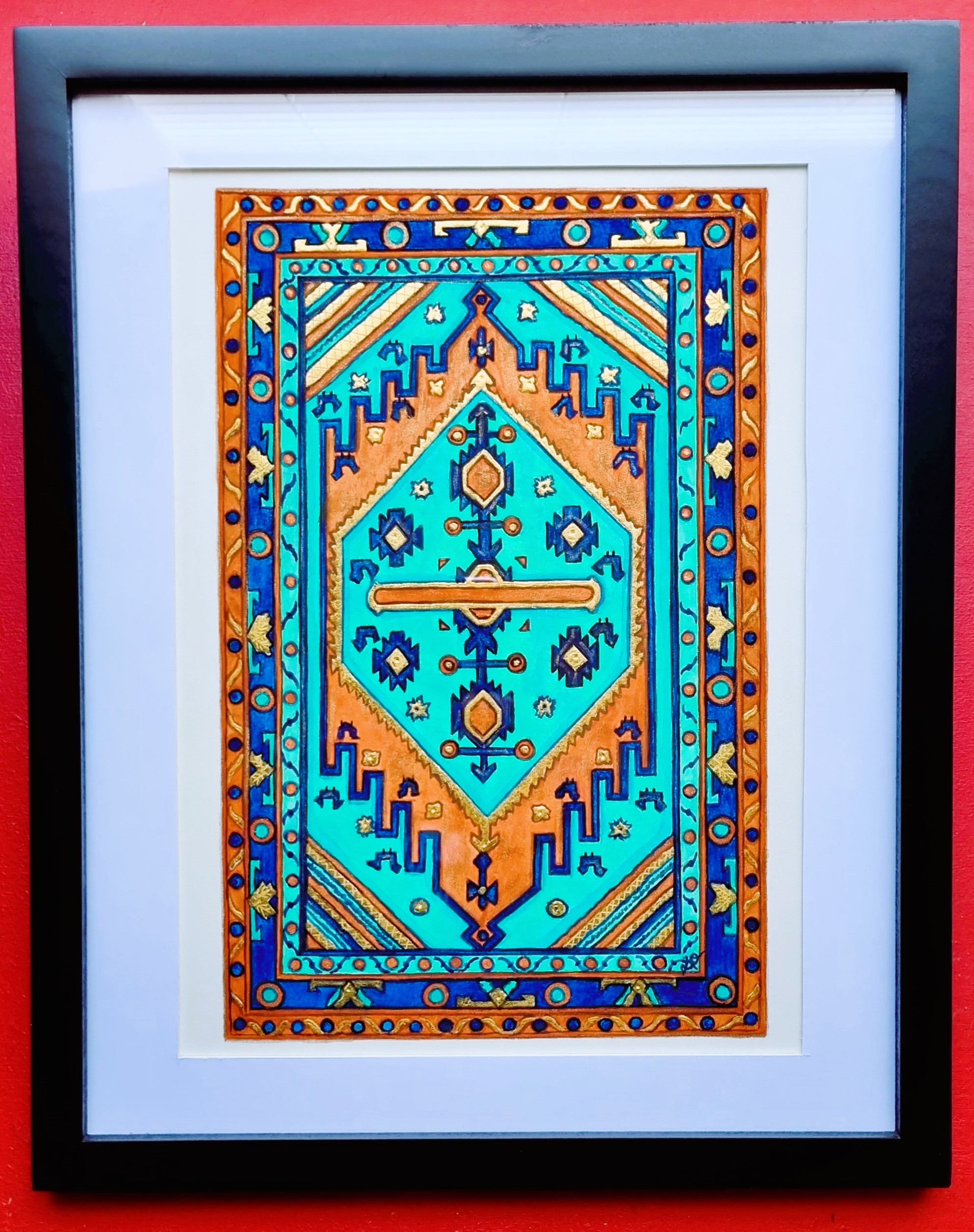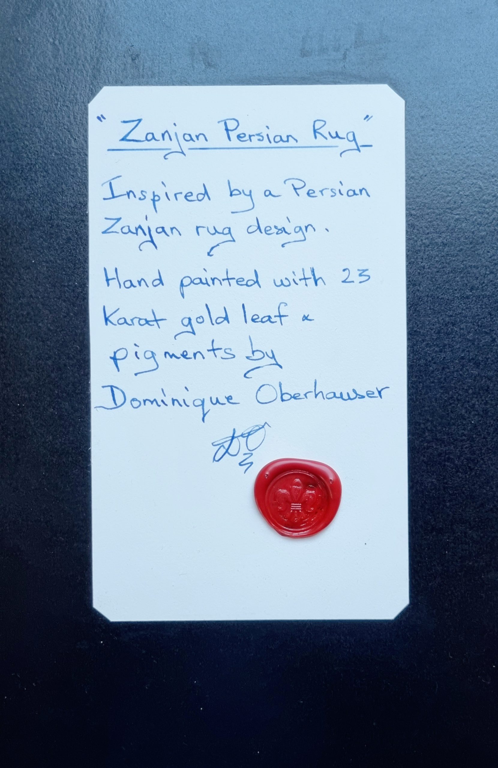 New painting inspired from a Zanjan Persian rug design, with green teal and burnt orange colours. Hand painted with 23 karat gold leaf and pigments.